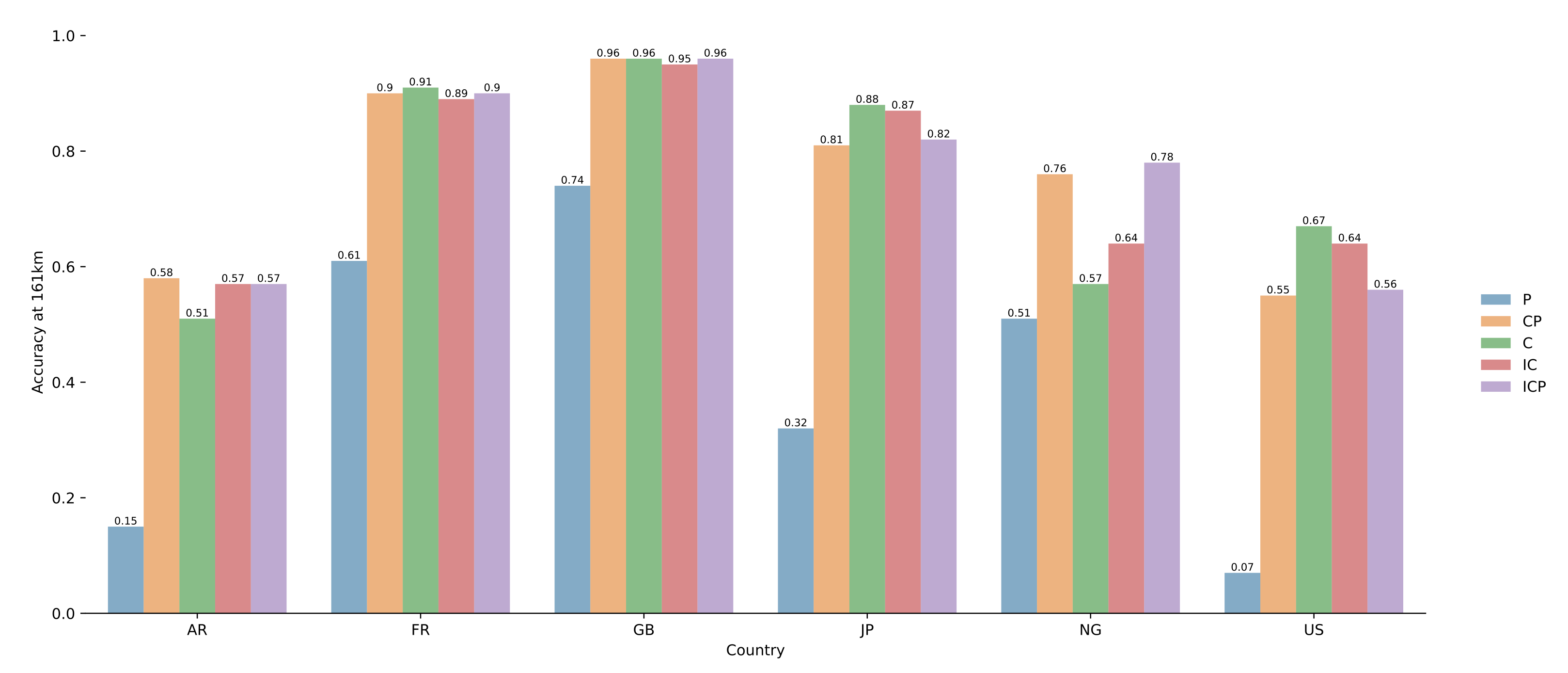 | Dataset | Country | A@161 | A@100 | A@50 | MDE | AUC |