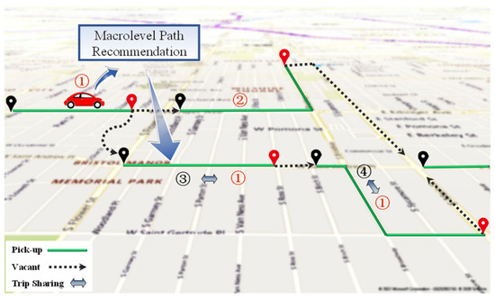 To solve these problems mentioned above, this paper combines the taxi travel path with the potential trip reallocation and builds a dynamic path recommendation model for continuous passenger pickup. This taxi service in the low-carbon context can minimize the total operating costs and emissions with trip sharing, which makes full use of the small fleet scale in the network to meet all travel demands, as shown in Figure 1.