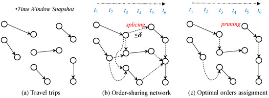 In the trajectory sharing network, the maximum match optimizes the fleet scale of valid taxi operations. According to the taxi order schedule, if it satisfies the temporal constraint between the drop-off point in the current trip and the pickup point in the next trip, the two trip trajectories can be spliced, as shown in Figure 2. By iteratively calculating until all trips are spliced, this allows the orders to be served with fewer vehicle assignments. In addition, the connecting time between trips must not exceed the upper limit δ. The maximum match generates a path set that covers the entire G, ensuring that all orders are served while minimizing the fleet scale of vehicles in this solution. This is also the optimal solution to the minimum fleet problem with parameter δ. In this paper, we use the matched M paths as the recommended paths for taxis to carry passengers continuously.