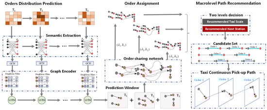 The recommendation of the continuous pickup path relies on the generation of the order-sharing graph, and we obtain it by training the historical data through a neural network layer. The recommended path is based on the trajectory splicing on the potential trips. Thus, the taxi service system operation can be transformed into an order-balanced assignment for on-demand acquisition by training a sharing graph for path recommendation. We propose a data-driven deep learning solution for obtaining order-sharing graph sequences, as shown in Figure 5.