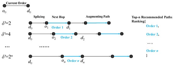 For a given taxi order, we augment this order by path splicing until all trips are traversed. Finally, we obtain the fully covered connected branch of G′ by the trajectory-splicing process. The recommended path of continuous pickup is the next-hop trajectory in the augmentation path. In practice, the taxi drivers have different tolerances for order delays, and it is difficult to increase their individual costs to meet the global optimum. The CTPURec defines a delay relaxation parameter δ′ to generate different augmented paths, which are ranked according to the travel cost to obtain the Top-n recommendation. When an OD request is made, the personalized δ′ is added for path splicing, so that different output paths are possible for the same request of different taxi drivers, as shown in Figure 4.