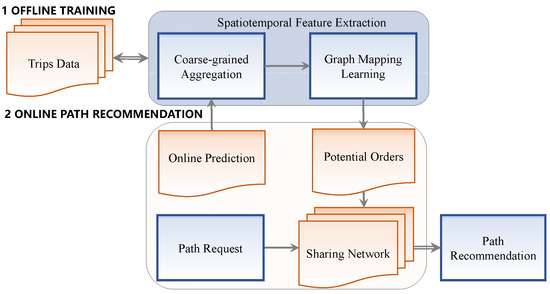 The CTPURec is a discrete dynamic path recommendation model that builds a continuous path based on the prediction of future travel demands. As the path recommendation is constructed based on a sharing network of potential orders, it first requires an accurate prediction of travel trips. We use the offline phase to train the historical taxi trip data, then the online phase to predict potential trips in real-time and generate recommended paths. The CTPURec defines and trains taxi demands and sharing network modules separately, and it interacts to capture the complex relationships between taxi trajectories and passenger pickup paths. The architecture of CTPURec can be subdivided into the spatiotemporal neural network for travel trip predictions and the trajectory sharing network for collaborative path recommendations, as shown in Figure 3. The spatiotemporal neural network generates a snapshot graph of the potential travel orders, which further extracts the ideal passenger pickup paths in the trajectory sharing network. This hybrid structure builds two levels of decision support, with system-level decisions guided by the minimum fleet size to satisfy the travel demands and user-level decisions to guide the next taxi trip selection.