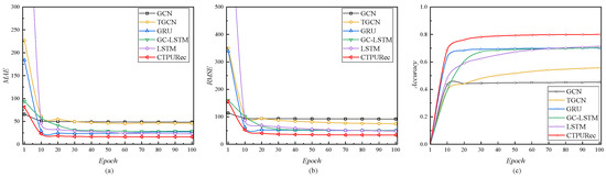 The purpose of this set of experiments was to examine the feature fitting ability of the CTPURec and the baselines during the iterative process. Since the CTPURec was based on spatiotemporal feature fusion, we focused on its feature extraction ability during the training process. The Figure 7a,b shows the variation of MAE and RMSE of the models at the 3-h prediction steps. It is worth noting that the training errors of GCN, GC-LSTM, and SANN were relatively small and reached stability quickly in the initial stage of model training, indicating that the learning rate of graph features was better than that of the time-series recurrent networks. As can be seen from the change of accuracy curve in Figure 7c, the CTPURec achieved better accuracy in the initial stage, which means that the adaptive semantic relations could fit the spatial relations of trips well.