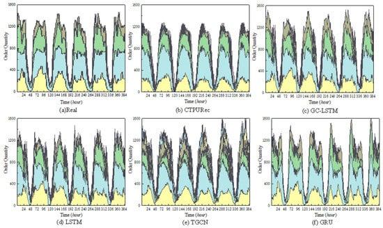 To clearly show the ability of different models to predict potential orders, we intercepted the change in overall order volume for the next 16 h prediction. As shown in Figure 8, we compared the TGCN, GC-LSTM, LSTM, GRU, and CTPURec, with different colors indicating different order magnitudes. In Figure 8b, the CTPURec uses adaptive spatial relations for prediction, and the fluctuation pattern of its order volume best matched the Real plot. The GC-LSTM also used dynamic neighborhood modeling, however, its nonlinear fitting ability was not as sufficient as that of the adaptive CTPURec. In outlier processing, LSTM and TGCN were more sensitive to sharply rising order quantity in the figure, while CTPURec generalized these orders. In Figure 8e, the fitted curve of TGCN fluctuates a lot. This is because the superposition of redundant spatial features increased the magnitude of the predicted values, resulting in an unstable curve. The GRU and LSTM are recurrent neural networks that performed predictions based on time series features. It can be seen that their performance was relatively stable, with no dramatic fluctuations in the prediction curves, but the fitting ability was not as good as that of the dynamic neighborhood model. As the GC-LSTM required constant dynamic adjustment of neighbor relationships, the spatial feature fitting ability was better than TGCN, but not as good as the CTPURec.
