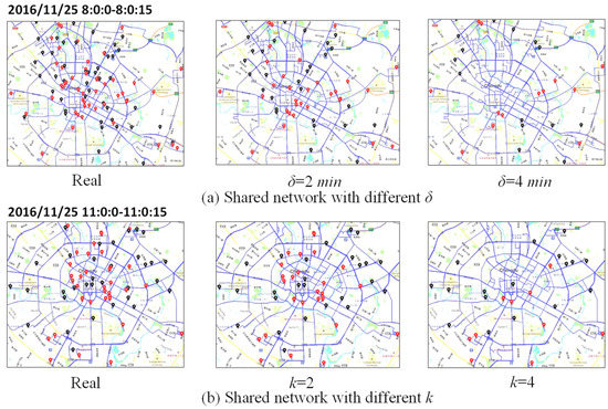 In addition to the limit on the maximum waiting delay, we further added a limit on the number of trips based on δ = 2 min, as shown in Figure 9b. The orders of Real within the time period 11:0:0–11:0:15 were mainly focused on suburban to downtown trips. The path splicing was performed on the basis of Real, and it can be seen that only a small reduction was performed for k = 2. For k = 4, a large number of orders were merged, resulting in a smaller fleet scale of taxis required for passenger travel, but increasing the additional cost of order splicing, such as the waiting time for splicing trips. Compared to the taxi order trajectories in Real, the trip distribution of the sharing network not only increased the order volume of the valid taxi, but also could have broken the distribution of the original orders and reallocated them in a uniform manner. The experiments illustrated that the order assignment strategy of the sharing network can reduce the taxi occupancy while satisfying the equal travel demands, which is achieved by recommending taxi orders on the spliced path for a given taxi.