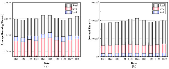 To evaluate the influence of pickup path recommendation for the taxi service system, the experiments evaluated the average taxi running time, taxi no-load time, average pickup waiting time, effective fleet size, and the average increased orders under different parameter configurations. The running time is the time span from the to of the first passenger order to the td of the last order on a natural day. The no-load time is the accumulation of the non-passenger carrying period during the operating hours. We counted the daily average running time and no-load time from 21–30 November 2016, as shown in Figure 10. The experiments adopted the maximum connection limit k = 2, 4, and the waiting delay δ was set to 2 min. From Figure 10a, the path splicing reduced the daily average running time, which was attributed to order sharing improving vehicle operating efficiency with fixed travel demand. With k = 4, the total number of vehicles was 18.54% less than that with k = 2, thus requiring more orders to be filled per vehicle. As a result, the average running time for k = 4 increased compared to k = 2. In Figure 10b, the taxi no-load time decreased as k increased, indicating that continuous pickup path recommendations reduced the no-load time of individual vehicles in general. The experiments showed that order-sharing networks reduced inefficient time consumption in taxi systems, allowing travel orders to be reallocated on-demand and increasing the efficiency of vehicle operation.