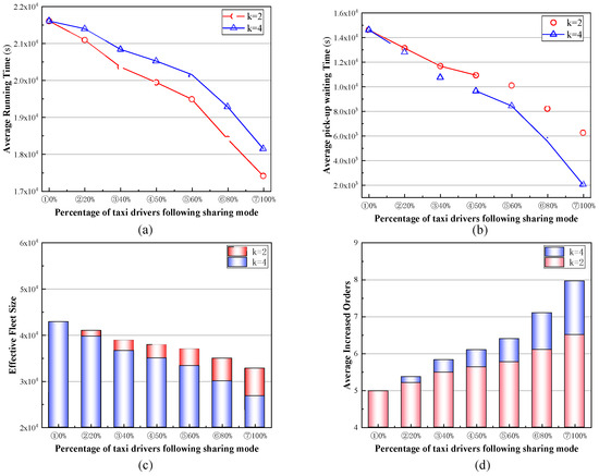 Impact of the different driver’s percentage participating in sharing mode. (a) is the average running time, and (b) is the average pick-up waiting time. (c,d) are the effective fleet size and average increased orders based on different percentage of taxi driver’s following sharing mode.