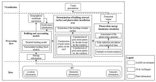 The first step in the accurate estimation of photovoltaic energy generation is to calculate the available installation areas of the facades and roofs. In this study, the available areas were extracted based on IFC data. Second, it is necessary to calculate the solar radiation incident on the specific geographical location of the building and the shadow occlusion produced by surrounding buildings. Finally, the photovoltaic energy generation potential can be calculated. A flow chart is shown in Figure 1.