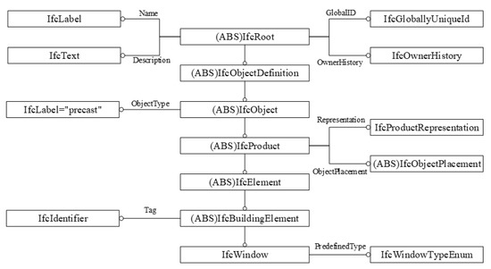 The IFC was defined using the EXPRESS data modeling language as defined by the Standard for the Exchange of Product Model Data (STEP) ISO 10303-11 [40]. EXPRESS is an object-oriented description language for information data, which focuses on the description and definition of data and respective relationships; it has strong modeling capabilities. Figure 2 shows the IfcWindow and related entities using the EXPRESS-G diagram. It describes the IfcWindow entity with its attributes and shows how the entities are related to each other. The attributes of the IFC entity were obtained through inheritance relationships. IfcElement is the supertype of IfcBuildingElement and IfcWindow is the subtype of IfcBuildingElement. That is, Name, Description, Representation and Object Placement were all inherited by the Window entity. These attributes allow us to use IFCs to obtain semantic information, attribute information, location information and others.