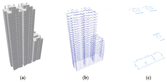 The grid center points on the building facades are obtained as follows: For an n-story building B, the ith floor is represented by where Gi represents the two-dimensional contour of the floor (i.e., the top-view projection of the facade), Fi represents the height of the floor from the ground and Hi represents the height of the current floor from the top surface of the floor slab to the ceiling (including the ceiling thickness). As shown in Figure 6, we traverse the contour set of the building floors and merge all floors with the same two-dimensional contour shape from the sth floor to the tth floor. The following set is obtained:, where represents the lowest ground height in the set and represents the accumulation of floor heights in the set.