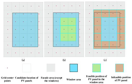 As shown in Figure 8a, each grid center point represents the central position of a photovoltaic panel that may be placed on the facade. Owing to the presence of window areas in the facades, grid center points on the facades need to be classified. The grid center points on the facades are divided into the feasible positions of the photovoltaic panel in the window areas, the feasible positions of the photovoltaic panel on the facades (except for the windows) and the infeasible position. As shown in Figure 8b, if the photovoltaic panel area is fully contained within the window area, the grid center point at the center of the photovoltaic panel is labeled as the feasible position of the photovoltaic panel in the window area. As shown in Figure 8c, if the photovoltaic panel area intersects with the window profile, the grid center point at the center of the photovoltaic panel is labeled as the infeasible position of the photovoltaic panel. Other grid center points on the facades are labeled as the feasible position of the photovoltaic panel on the facade (except for the windows).