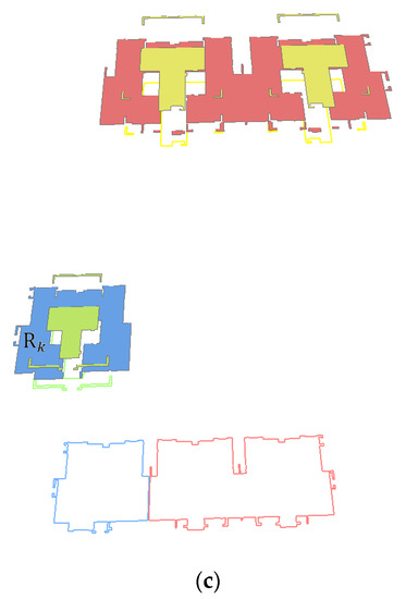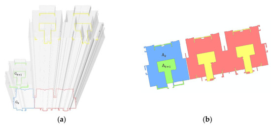 The grid center points in the plane can be obtained as follows: As shown in Figure 9 for the merged floor set , with the same two-dimensional contour, there are floor sets and with upper and lower floors. Their corresponding contour lines and have an intersection or inclusion relation in two-dimensional space and the surrounding areas are and , respectively. A Boolean subtraction is performed on and and the result of the operation is the two-dimensional geometry of the roof (if is the highest floor, the surroundings of are considered the two-dimensional geometry of the roof). We move the calculated two-dimensional geometry to height to obtain the roof plane .