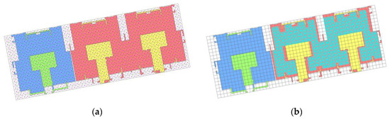 The IFC data used in this study were calculated and stored in the form of triangular patches, each with its own attribute ID annotation. In our method for extracting the exterior surface of the building, we divide the building components into two parts, floor slab and non-floor slab. (1) The selection criterion of the outer surface of non-floor building components is that the normal direction of the IFC triangular patch is perpendicular to the x- and y-plane and there is only one surface adjacent to the external space; then, the triangular patch is retained as the triangle of the outer surface patches and given an ID. (2) The outer surface of the floor slab is determined through the normal direction of the triangular surface of the floor slab, which is parallel to the x- and y-plane, and then retaining the triangular surface, which is the outer surface of the slab facade. The remaining triangular patches are the upper and lower slabs. The selection criterion of the upper outer surface of each floor is the difference between the two-dimensional current floor and the two-dimensional upper floor. The selection criterion of the lower outer surface of the floor is the difference between the two-dimensional current floor and the two-dimensional lower floor. In the same way, the selected triangular patch records the ID of the original component of the triangular patch. Then, we aggregate all triangular patches together according to ID. Through the above process, the exterior surface information with semantic information of all building components of the entire IFC model is obtained. Extracting the outer surface of the building greatly reduces the subsequent workload (e.g., shadow occlusion calculations). Figure 5a represents the IFC data of a floor and Figure 5b shows a schematic diagram after obtaining the external surface of the building.
