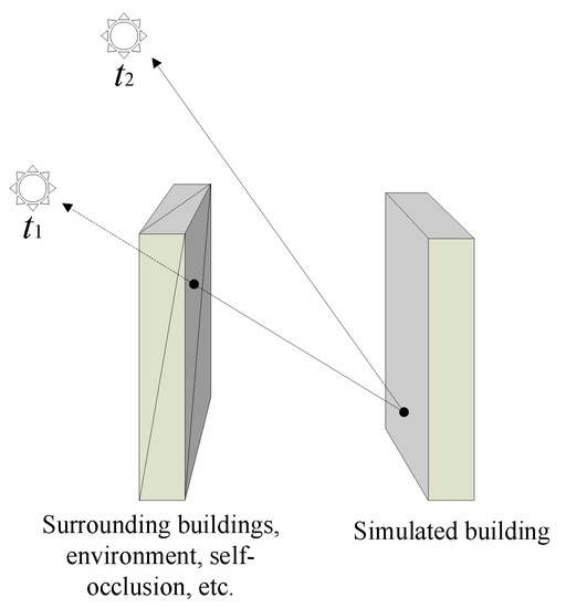 The analysis needs to consider whether the surface of the building receives solar radiation, which is related to many factors, including the location of the building, surrounding environment and location of the sun. The position of the sun at a specific moment can be calculated from angles such as the solar altitude angle listed in the above equations. The exposure (or lack thereof) of a certain point of the building to sunlight was determined as shown in Figure 12. The position of the sun was calculated for times t1 and t2. At t1, a ray from the surface of the building points to the position of the sun at time t1. The analysis determined whether the ray intersected with buildings or the environment’s triangular patches. As time t1 was intersected, it was sheltered and the sun could not reach the selected point on the building surface. For the same reason, time t2 was evaluated.
