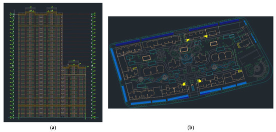 This study used the building planning and design drawings (two-dimensional CAD electronic drawings) provided by the Xinyi City Natural Resources and Planning Bureau as the original data (Figure 13). The main analysis of the building comprised the use of a self-developed CAD-based 3D modeling program to generate an IFC-based BIM model of the building with detailed building component information. To simplify the calculation, the surrounding building models relied on building block models constructed by building footprints and building heights.