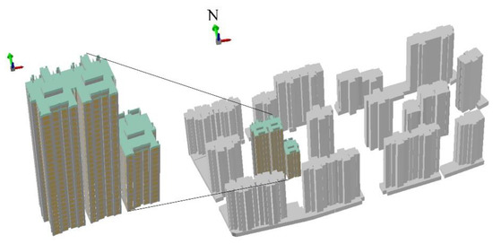 We selected a residential building in Xuzhou city, Jiangsu Province, China, as the object for the simulation experiment (Figure 14). The approximate location of the building was 118.35 E and 34.37 N. The simulated building covered an area of 836 m2 and a height of 91 m. The facade orientations were 10.635° east–north, 10.635° north–west, 10.635° west–south and 10.635° south–east. There were 14 residential buildings around it; the three-dimensional models of these surrounding buildings played a key role when performing shadow occlusion calculations on simulated buildings.