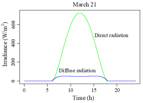 To calculate the solar radiation, the input parameters included the latitude and longitude coordinates of the simulated location, the slope and aspect of each external surface of the building, time, atmospheric clearness index, solar position, presence of shadows and other factors. These parameters were obtained through the equations and relevant data presented in Section 2.3. The atmospheric clearness index was calculated using cloud data and the cloud data used in this study were based on MODIS data [65]. The total cloud amount data used in this study are a product of Terra Satellite’s standard monthly average of the total cloud amount data of level 3. Accordingly, the cloud data for a given month were obtained. Figure 15 shows the solar radiation from the roof. Figure 15 compares the direct and diffuse radiation changes during the spring equinox (21 March).