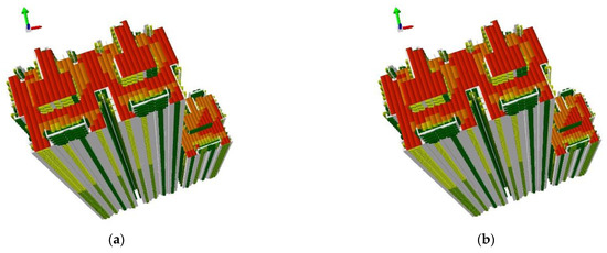 After the extraction of the external surface, the extracted area included the facade (excluding windows), windows and roof of the building. According to the method described in Section 2.2, the grid center points of the facades and roofs were generated. We needed to take into account the size of each photovoltaic panel represented by each grid center point for the calculation accuracy and the calculation time. Carneiro et al. [64] set the resolution of flat and tilted rooftops and facades to 0.25 m2; the higher the resolution, the larger the time required for the calculation. Hofierka and Zlocha [46] set the voxel to 2.5 m, which reduced the calculation time but also decreased the accuracy. Some scholars have defined the spatial resolution of rooftops and facades as 1 m2 [10,42,52]. Based on previous studies and considering photovoltaic panels of approximately 1 m2, the grid center points were set at 1 m intervals. All grid center points at less than 1 m interval were deleted. As such, the number of grid center points represented the number of photovoltaic panels. The statistics describing the area of each building element are shown in Table 1.