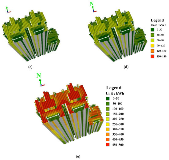The photovoltaic generation of the building was simulated based on the calculation formula for photovoltaic energy generation (see Equation (12) in Section 2.3), available installation area of the extracted building elements, calculation results of solar radiation and shadow occlusion generated by surrounding buildings or self-occlusion. The results are shown in Figure 16, while the statistical results are given in Table 2.