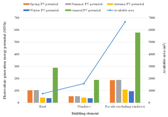 Figure 17 shows the available facade and roof areas of the building simulated in this study and the photovoltaic energy generation in different time periods. The available area of the facades (excluding windows) was much larger than that of the roofs. The photovoltaic energy generation of the facades (excluding windows) for different time periods was also much larger than that of the roofs. The installation of photovoltaic panels on the windows would increase the energy generation of the facade even more. Our results confirm that the photovoltaic energy generation potential of the facades was huge; therefore, the evaluation of the available facade area should play an important role in photovoltaic simulation.