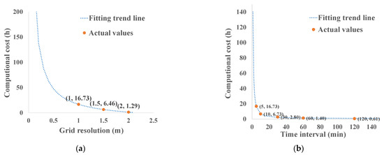 Functional relationship between the (a) grid resolutions and (b) integration time interval and the computational cost.