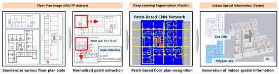 The overall framework can be divided into three phases: (1) normalized patch extraction, (2) patch-based floor plan recognition via deep networks, and (3) generation of indoor models. Conventional studies on automatic floor plan analysis rely on handcrafted features based on geometry. This methodology is useful for the extraction of simple objects, such as walls of a certain thickness with straight lines, and does not overlap with other graphics. However, this approach is limited in that it tends to specify a particular format of floor plan that cannot be generalized to other formats. In particular, when applied to large-scale complicated floor plans, this limitation is emphasized because the divergence in drawing scale is greater for large buildings than houses.