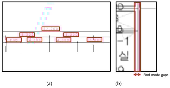 Regarding auto detection of scale, we used two different methods: (1) utilizing information from dimension lines in floor plans, and (2) extracting and utilizing the pixel size of the thinnest wall if there is no dimension line (Figure 3). If rich information exists in the floor plan itself, it is reasonable to use it. The floor plan is drawn proportional to the actual building, and its magnification is plotted using dimension lines. Through optical character recognition (OCR), the number of labels and corresponding pixel distance can be extracted, and, as a result, the distance per pixel (i.e., scale) can be calculated. The accuracy was improved by utilizing the median value of the scales measured in several numerical lines existing within a one-floor plan. Many floor plans have missing dimension lines for various reasons, for example, when the floor plan is not an architectural drawing (e.g., real estate floor plans and evacuation guide maps). It is important to be able to respond in this case (i.e., missing dimension lines) by generalizing our methodology. Buildings are generally geometrically structured; hence, it is not necessary to specify the thinnest walls in the floor plan. Histograms with data that count the consecutive pixel distances for each x- and y-axis were drawn; then, the pixel distance to be used as a scale criterion was specified by calculating the mode. To achieve robust results, non-maximum suppression was applied to the histogram prior to mode calculation. This process allows matching the scale on the input image of various floor plan sizes, even without dimension lines.