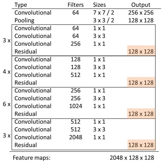 CNN architecture; note that the shaded parts are modifications from the original ResNet-50 [20] to improve the resolution of the output.