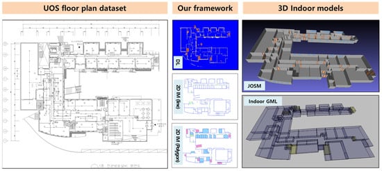 The main purpose of extracting indoor spatial information in vector form from floor plan images is to reconstruct indoor building structures. To show the application of our result in a compatible way, we converted our indoor models into Java OpenStreetMap Editor plugins [24], and IndoorGML (OGC standard for an open data model and XML schema for indoor spatial information) [25], which have the potential to be compatible with 3D modeling programs such as Sketchup, BIM, and Open Street Map (see Figure 5). In addition, it can be integrated adaptively with other standards such as CityGML [26], making the 3D indoor models compatibly expanding to the surrounded outdoor city models, beyond the building level.