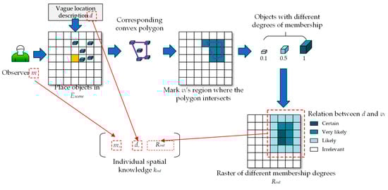 Begin olist= According to the subjective perception of d, m places objects in Escene; groups = Group olist based on membership and sort the groups by membership value in ascending order; for i = 1 to length(groups) group = groups[i]; convex = Establish a minimum convex polygon based on the positions of the objects in the group; blocks = Find all ei that intersect with convex in Escene; rlist = Find the rasters in Vraster corresponding to blocks; All membership in rlist = membership value of the group; Update rlist in Vraster; Rind = All raster areas in Vraster such that membership≠0; kind = (m, d, Rind); Return kind; End |