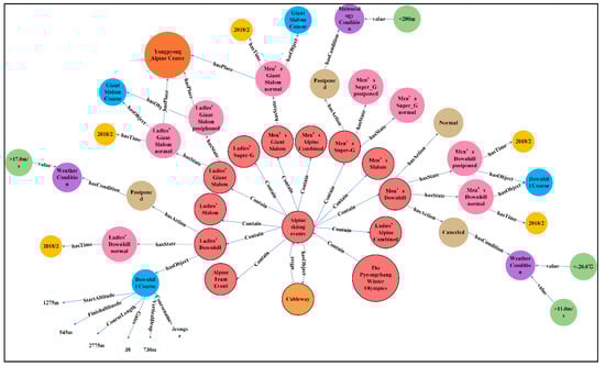 According to the above-mentioned method of KG in Section 3, data preprocessing was done at first to make the dataset standardized and accurate. The events data were extracted from the dataset. The entity and attribute information were designed to be directly extracted from structured dataset. After that, with the help of LAC tool [51] (an open source word segmentation tool) and self-built domain dictionary, the text data were further processed. Words were segmented and their part of speech were tagged, the stop words were also removed. The object, characteristic, and relationship information were finally extracted and fused by relation template, and the triplet set of alpine skiing event knowledge was obtained. All the knowledge was stored and managed using the Neo4j database.