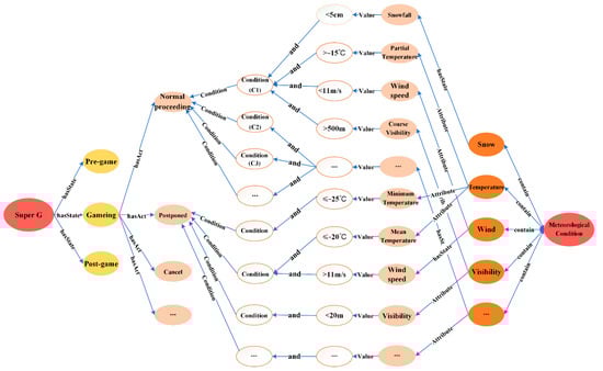 Risk assessment is evaluating the potential impact of an event [50]. Rule-based knowledge is an important basis for risk assessment. We express the indicators and rules from Table 2 using KG. According to the proposed “Characteristic value-Relation” representation method, two conditional nodes are connected with characteristic values of different objects, and the influencing conditions between objects are represented through the combination of characteristic. For alpine skiing events, same action conditions may be caused by more than one meteorological factors. As shown in Figure 3, Super G contains “Normal proceeding”, “Postponed” and “Cancelled” actions. Different actions can be triggered by different conditions. One of the conditions of “Normal proceeding”, c1 in Figure 3, consists of four meteorological factors, which are air temperature, wind speed, visibility of race tracks, and the amount of snowfall. For the decision of “postponed”, they require the temperature lower than −20 °C and wind speed faster than 11 m/s; the visibility shorter than 20 m for c2, and the temperature lower than −25 °C.