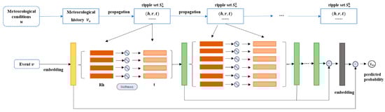 The network structure of RippleNet is shown in Figure 4. In the embedding section, the framework uses TransE embedding. Let item-v pass through embedding and then get . That given the historical record of meteorological condition as . The triple of the first-order wave set and the event risk will calculate a correlation probability as follows: