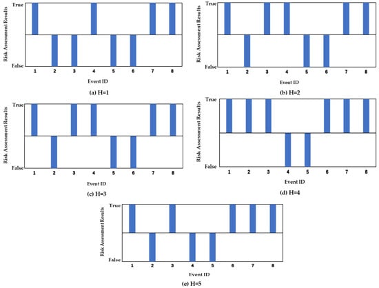 As we can see from Figure 5, the accuracy increases as increases, with the best results at = 4, and then decreases. Eight groups of sample data from two Winter Olympic Games were selected to display the assessment results under different H parameters, as shown in Table 3. We use the risk indicator rule-based (Table 2) approach for comparison. The RippleNet model with different H values was tested using these 8 sets of data, and the test results are shown in Figure 6. When = 1, the accuracy was the lowest with four sets of data errors (Figure 6a). When = 2, = 3 and = 5, there were three sets of data errors for the eight samples (Figure 6b,c,e). When = 4, the assessment accuracy was the highest with two sets of data errors which is Men-Super-G by Alpine in 2018 and Downhill by Vancouver in 2010 (Figure 6d). The former had reached 13.0 m/s of wind speed at the competition venue, and the model assessed that the competition needed to be cancelled. However, the actual situation was that the organizing committee postponed the competition, because the model did not take into account the special nature of the Winter Olympics (the official events cannot be cancelled). In 2010, 1.52 mm of rain fell on the field, and the model assessment indicated that the event could continue, when in fact the organizing committee postponed the event. The margin of error may be due to the fact that during similar events like the Women-Giant-Slalom, 3.30 mm of rain fell, but the race continued as normal.