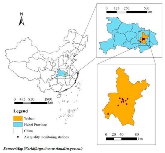 The dataset of hourly concentrations of air pollutants was downloaded from the website https://quotsoft.net/air/ (accessed on 27 June 2021), a third-party website publishing air quality data crawled from China National Environmental Monitoring Center (Beijing, China, http://www.cnemc.cn/, accessed on 27 June 2021). The data are collected from ten national control points in Wuhan (Donghu Liyuan, Hanyang Yuehu, Hankou Huaqiao, Wuchang Ziyang, Qingshan Ganghua, Zhuankou Xinqu, Hankou Jiangtan, Wujiashan and 182 Minzu Avenue, with Chenhu Qihao as the reference site), the spatial distribution of which are depicted in Figure 1. The missing hourly value is replaced by the average value of other hours, and then the daily concentrations from ten sites are calculated and averaged into daily means of Wuhan.