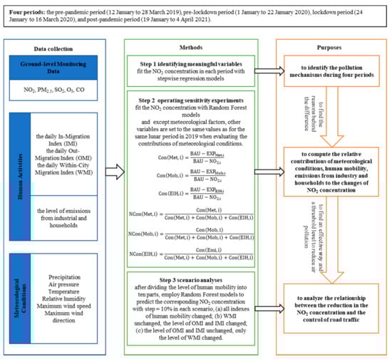 First, to identify the pollution mechanisms during four periods, including the pre-pandemic period (12 January to 28 March 2019), pre-lockdown period (1 January to 22 January 2020), lockdown period (24 January to 16 March 2020), and post-pandemic period (19 January to 4 April 2021), we fitted the NO2 concentration in each period with stepwise regression models and identified meaningful variables. Second, we fitted the NO2 concentration during the pre-pandemic period with Random Forest models and computed the relative contributions of meteorological conditions, human mobility, emissions from industry and households to the changes of NO2 concentration through three groups of nine sensitivity experiments. Third, we employed Random Forest models to simulate the changes of pollutant concentrations with the decrease in human mobility in different scenarios for road traffic control. The flowchart of methodology is illustrated in Figure 2.