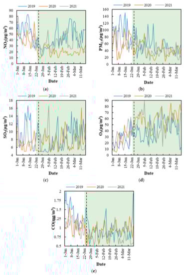 Observed changes in air pollutants over three years: (a) NO2; (b) PM2.5; (c) SO2; (d) O3; (e) CO (The black dashed vertical line means the date of the Spring Festival and the green area means the lockdown period in our study.).