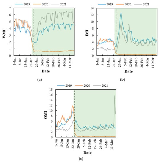 Changes in human mobility over three years: (a) WMI; (b) IMI; (c) OMI (The black dashed vertical line means the date of the Spring Festival and the green area means the lockdown period in our study. The daily In-Migration Index (IMI) and Out-Migration Index (OMI) represent the inflow and the outflow traffic volume, and the daily Within-City Migration Index (WMI) represents human traffic mobility within the city).