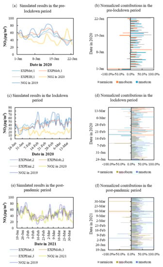 The simulated NO2 concentrations and the normalized contributions in three periods: (a) Simulated results in the pre-lockdown period; (b) Normalized contributions in the pre-lockdown period; (c) Simulated results in the lockdown period; (d) Normalized contributions in the lockdown period; (e) Simulated results in the post-pandemic period; (f) Normalized contributions in the post-pandemic period. (, and mean the normalized contributions of meteorological conditions, human mobility and emissions from industry and households. EXPMet,i means the simulated NO2 concentrations in RF model run with meteorological variables in i period and other variables in 2019; EXPMob,i means the simulated NO2 concentrations in RF model run with variables about road traffic in i period and other variables in 2019; EXPEIH,i means the simulated NO2 concentrations in RF model run with variables about emissions of industry and households in i period and other variables in 2019, where i = 1 means the pre-lockdown period, i = 2 means the lockdown period and i = 3 means the post-pandemic period).