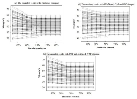 The simulated results of the decreased road traffic and the NO2 concentration: (a) 3 indexes changed; (b) WMI fixed, OMI and IMI changed; (c) OMI and IMI fixed, WMI changed).