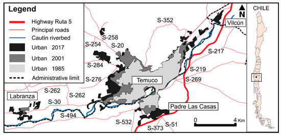According to the 2017 population census, the city of Temuco in the Araucanía Region has a population of around 320,000 inhabitants. The urban area is composed of the urban areas in the municipalities of Temuco, Padre Las Casas, and Vilcún (see Figure 1).