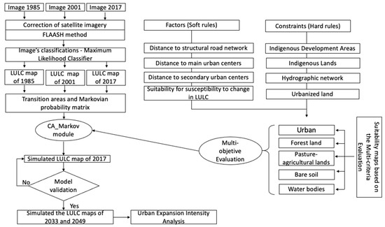 This work uses optical satellite images to simulate Temuco’s urban growth through to 2049, based on the period from 1985 to 2017 (see complete sequence of the method in Figure 2). The images were acquired by the Landsat-5, -7 and -8 spacecraft from 1985, 2001 and 2017, respectively, and downloaded from the Earth Explorer service (https://earthexplorer.usgs.gov/ (accessed on 21 February 2021)) of the US Geological Survey (Table 1). All images correspond to radiometrically calibrated and orthorectified products (Level-1 terrain precision, L1TP) whose at-sensor radiances were later converted into surface reflectance using the Fast Line-of-sight Atmospheric Analysis of Spectral Hypercubes (FLAASH) atmospheric corrector, available in Environment for Visualizing Images (ENVI) 5.3© (Exelis Visual Information Solutions Inc., Broomfield, EE.UU.).