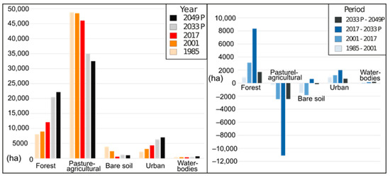 Figure 1 and Figure 3 express the process of urban expansion and land cover changes between 1985 and 2017. As can be seen, both forest as well as urban surface areas expanded, by 50.2% and 96.1%, respectively. However, the areas assigned to pasture-agricultural land zones, water bodies, and bare soil decreased, with the latter falling by 85.9% (see Figure 3).