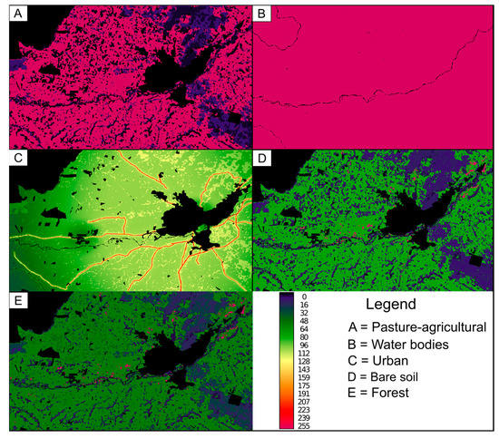 Regarding the criteria that limit urban development (Boolean covers), the variable “Indigenous Development Areas” (ADI) reveals the direct relevance of Mapuche population sectors in the study area [29]. ADIs are areas where indigenous development will be focused, according to the provisions of Law 19,253, while “Indigenous Lands” are protected areas where an indigenous person or community resides. The hydrographic network and the land urbanized by 2017 was added to the above, based on the urban area that had already been consolidated, where there is zero probability that it will be urbanized again by the proposed model.