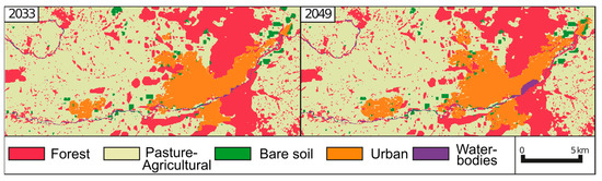 The results of the Markov chains and the Multi-criteria/multi-objective evaluation were used to simulate land use and cover for 2033 and 2049, with the transitions obtained between 2001 and 2017 used for the former and the transitions between 1985 and 2017 for the latter. Figure 4 shows the suitability maps for each objective evaluated, which correspond to each land use and land cover and where one can observe that, for the objective of urban suitability, the paired comparison matrix from the AHP allowed the weights or eigenvector for each factor analyzed to be obtained, with the distance from the main urban center and distance to the secondary urban center having a 74.5% impact (see Table 6).