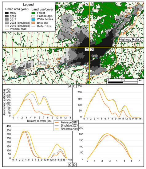 Simulation of urban growth of the city of Temuco as a function of distance. Source: Authors’ compilation.