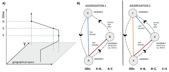 Illustration of a space–time trajectory consisting of a series of presence snapshots (A). The snapshots can be aggregated into trip records in multiple ways in mobile phone datasets, which can lead to differences in the resulting origin–destination (OD) pairs (B).