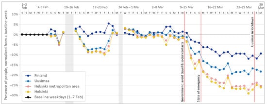 The varying presence of people at the municipality level compared to the baseline weekdays (1–7 February) in Helsinki, Helsinki metropolitan area (four municipalities), Uusimaa (26 municipalities), and in Finland (311 municipalities).