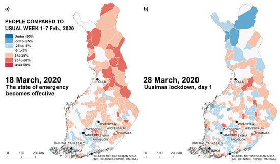 - Finnish Government. Movement Restrictions to Uusimaa—the Government Decided on Further Measures to Prevent the Spread of the Coronavirus Epidemic. 2020. Available online: https://valtioneuvosto.fi/en/-//10616/uudellemaalle-liikkumisrajoituksia-hallitus-paatti-uusista-lisatoimista-koronaepidemian-leviamisen-estamiseksi (accessed on 1 November 2020).