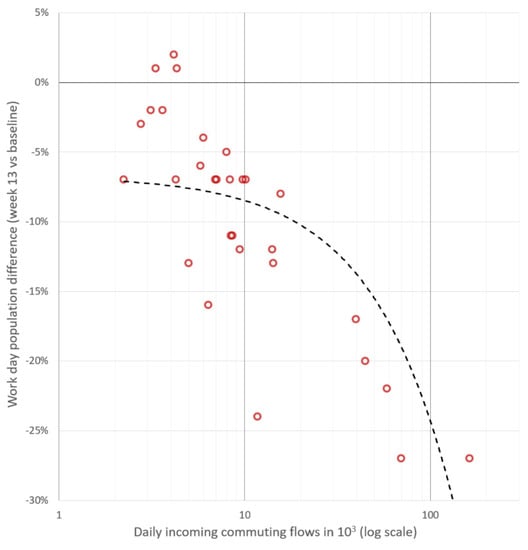 The correlation between daily incoming commuting flows (per 1000 commuters, log scale) and the change in workday presence of people from the baseline in case of the 30 largest municipalities in Finland.